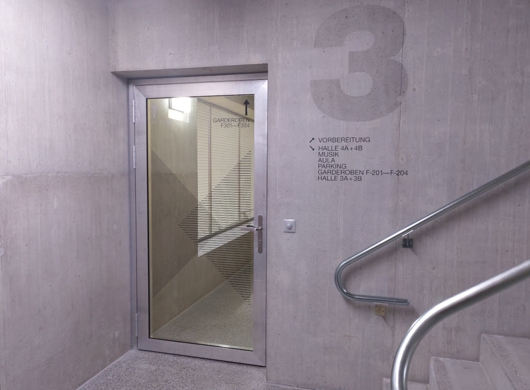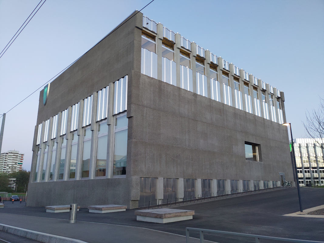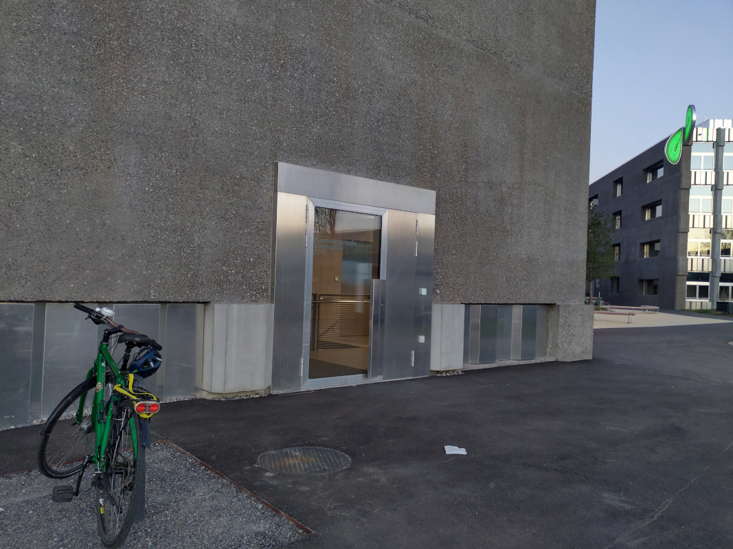 Rund um das Gebäude gibt's unbedeckte Veloparkplätze. Am besten wird am Ende der rechten Seite des Gebäudes parkiert, gerade neben dem unbeschrifteten Eingang.