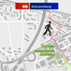 Die S-Bahnen S11 und S12 halten in Glanzenberg (Ankunft aus Zürich: 19:17; Ankunft aus Dietikon 19:17). Von dort läuft man zehn Minuten bis zur Halle (siehe Plan nebenan)